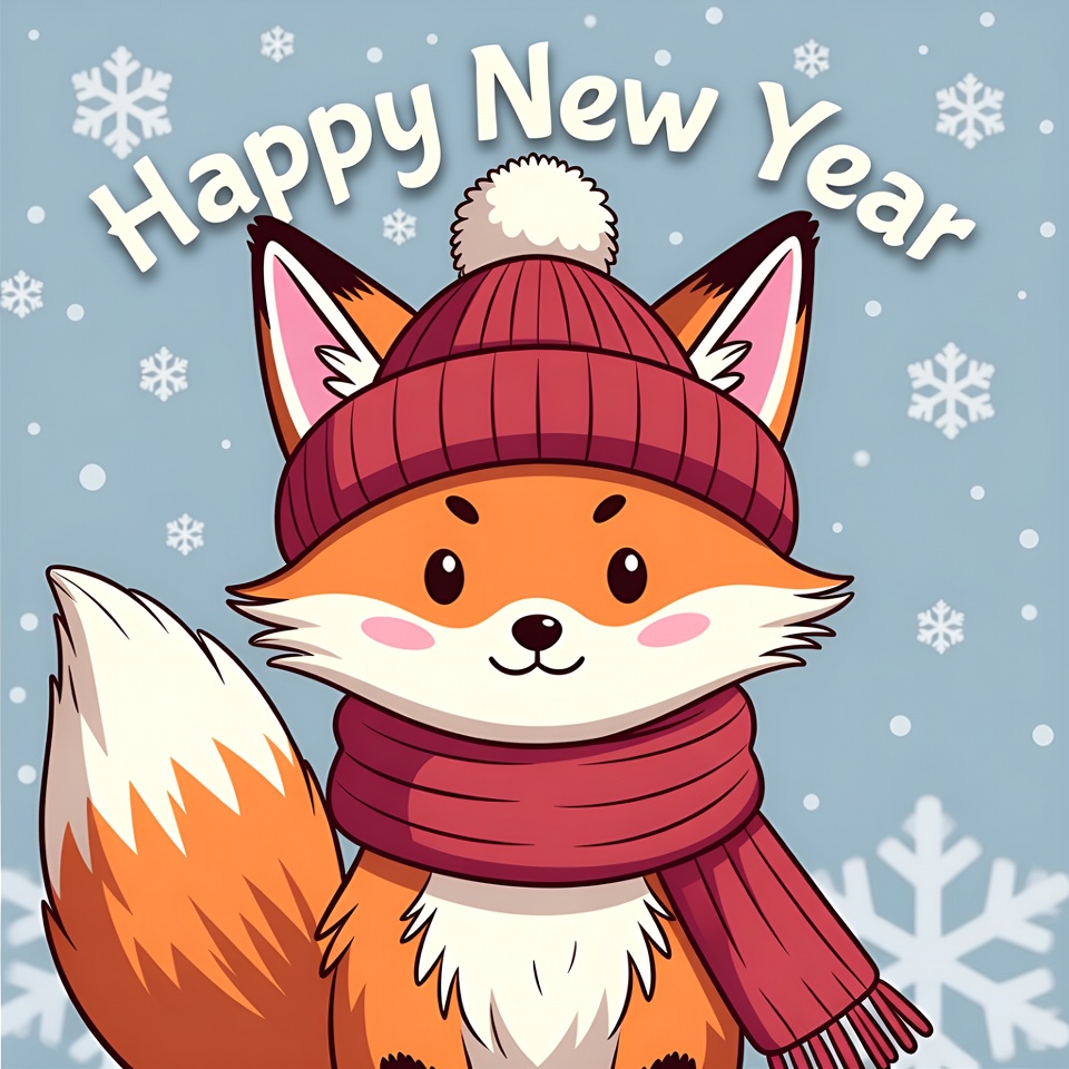A cheerful fox wearing a red hat and scarf smiles against a snowy backdrop, displaying a festive New Year greeting.