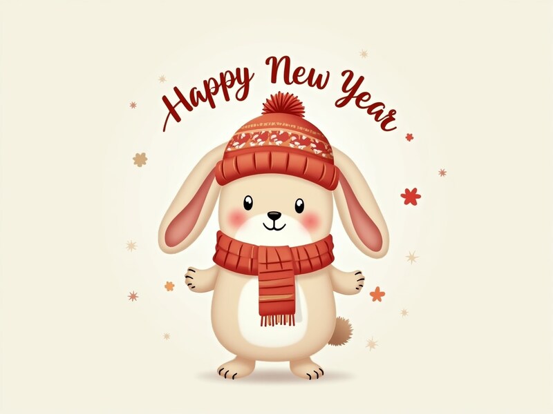 A cute bunny wearing a red hat and scarf stands happily, wishing everyone a joyful New Year with colorful decorations around.