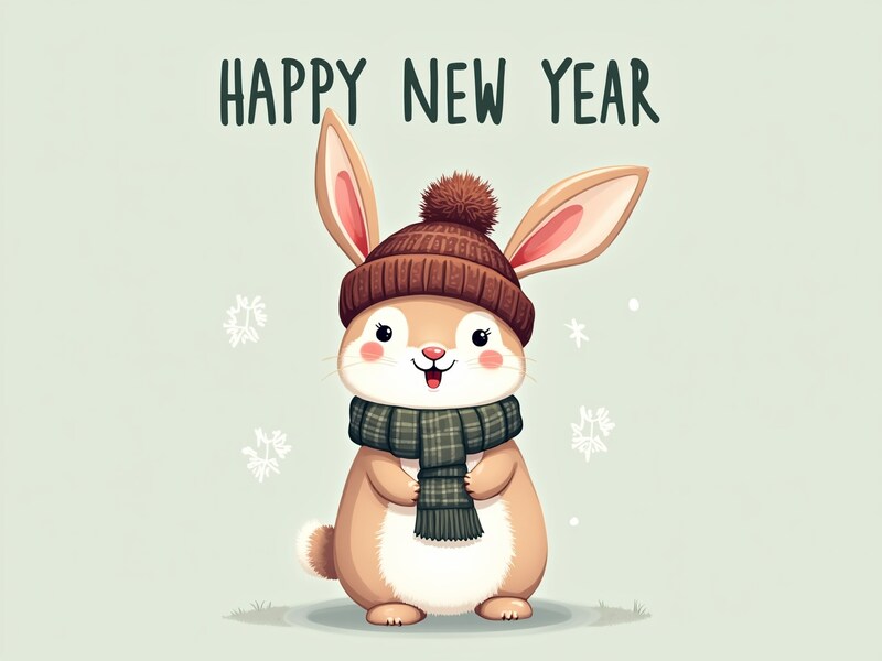 A cheerful bunny in a brown hat and green scarf stands happily, wishing everyone a happy New Year with a snowy backdrop.