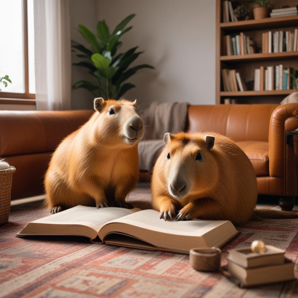 Two capybaras sit on a soft rug, curiously looking at an open book in a warm and inviting living room setting.