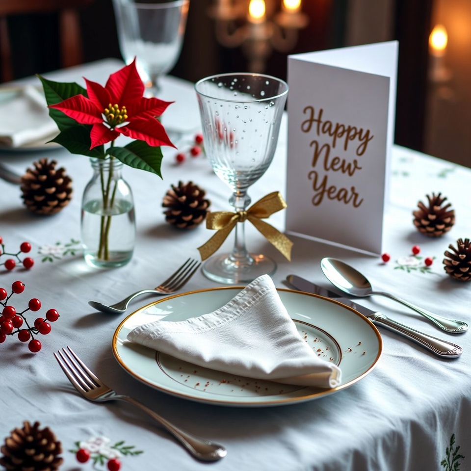 candlelight, celebration, cutlery, dining, dinner table, elegant setting, family gathering, festive atmosphere, festive decoration, flowers, glassware, holiday celebration, new year, pine cones, poinsettia, red berries, special occasion, table setting, white tablecloth, winter