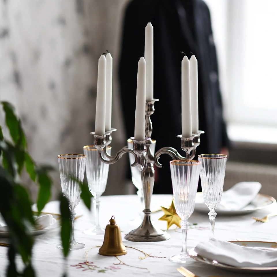 candelabra, candles, celebration, cozy atmosphere, dining table, dinner party, elegant dinner, elegant setup, festive decorations, fine dining, floral pattern, glassware, holiday gathering, indoor space, party setup, silver, soft lighting, star decoration, table linens, warmth