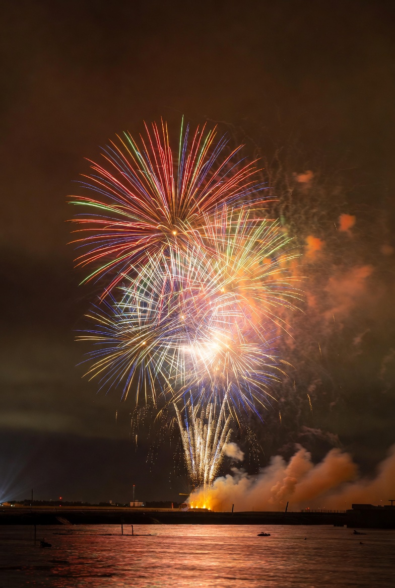atmosphere, beauty, bright, celebration, colors, crowd, display, entertainment, evening, explosions, festival, festive, fireworks, happiness, joy, lights, night sky, reflections, water, waterfront