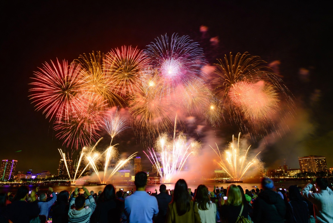 audience, bright, celebration, city, colorful, display, entertainment, event, explosions, festive, fireworks, horizon, illumination, night sky, nightlife, party, pyrotechnics, smoke, spectators, water