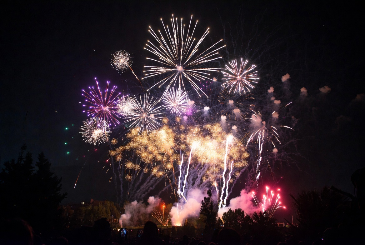 bursts, celebration, colorful, crowd, darkness, display, entertainment, event, excitement, festival, fireworks, illumination, joy, lighting, night sky, noise, outdoor, spectators, summer, treetops