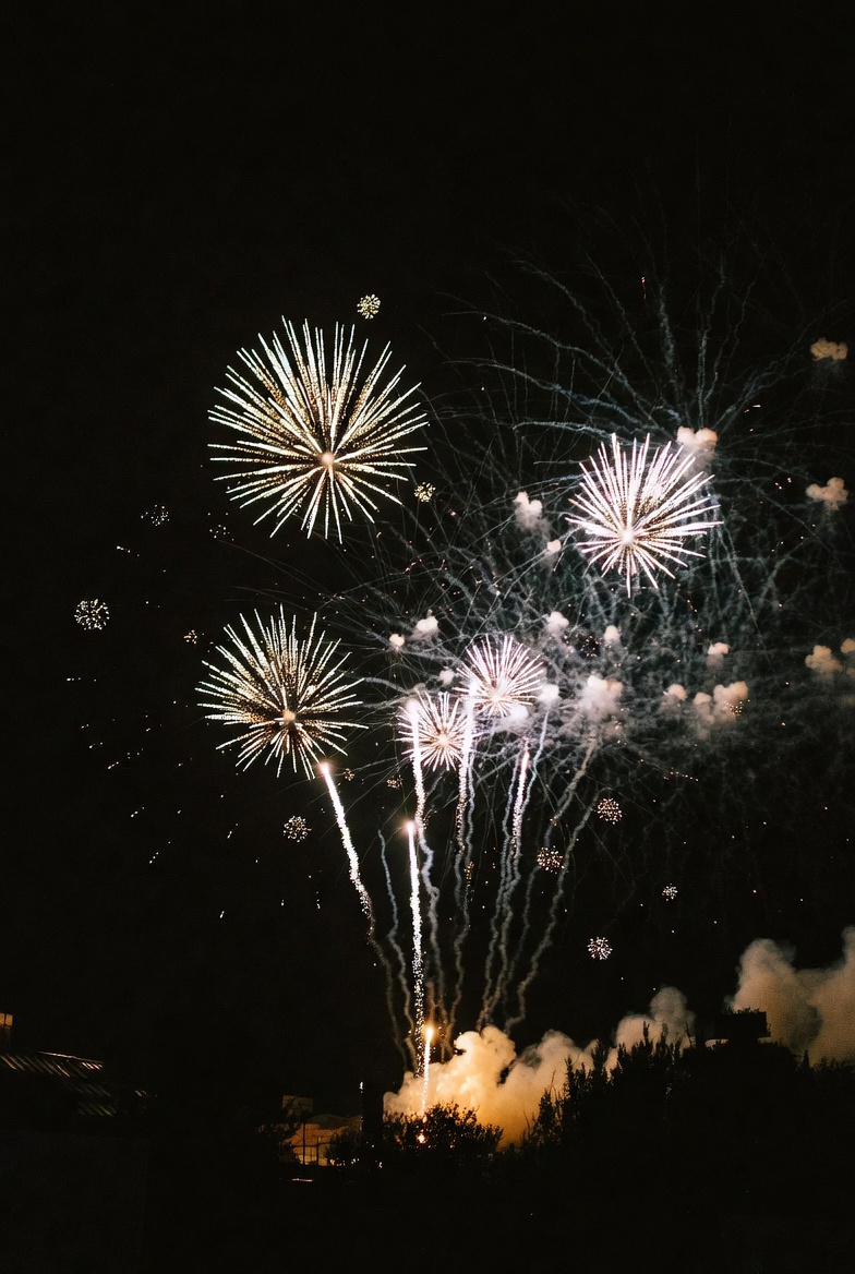bright colors, bursts, celebration, display, excitement, explosions, festival, festive, fireworks, gatherings, holiday, illumination, joy, night, night sky, outdoor event, people watching, smoke, sparkle, summer event