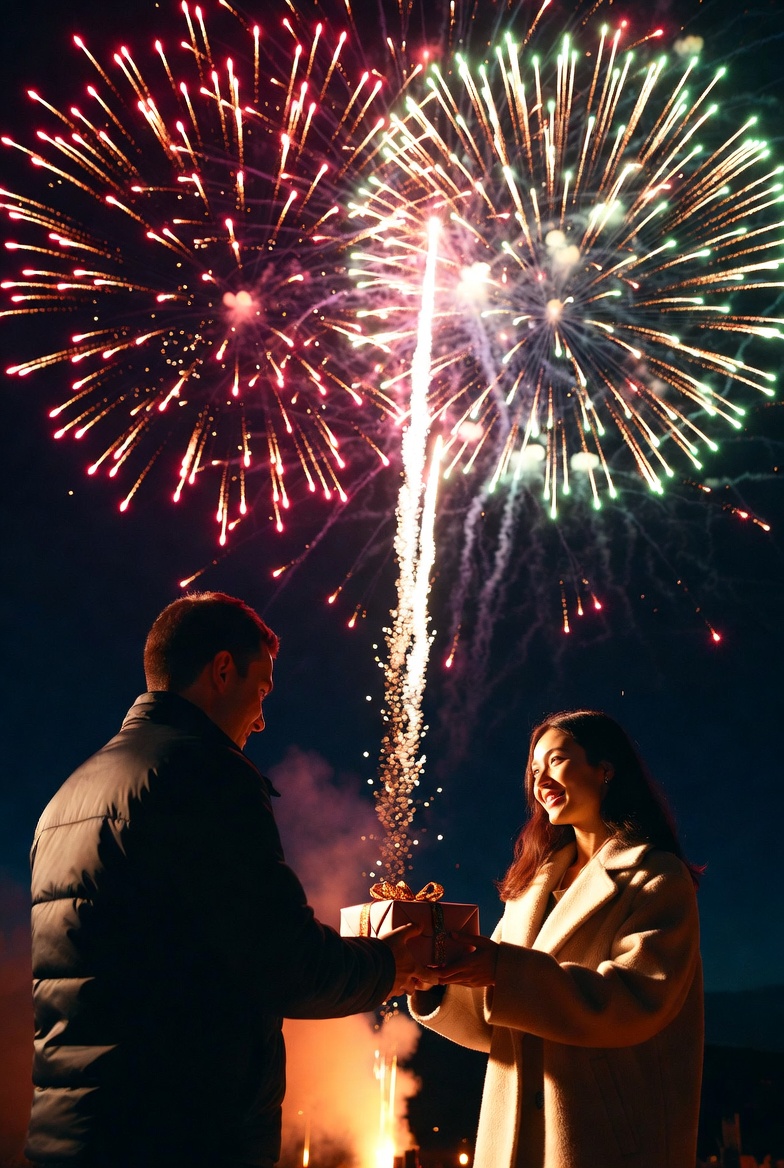 A man surprises a woman with a gift while vibrant fireworks light up the night sky, creating a festive and romantic atmosphere.