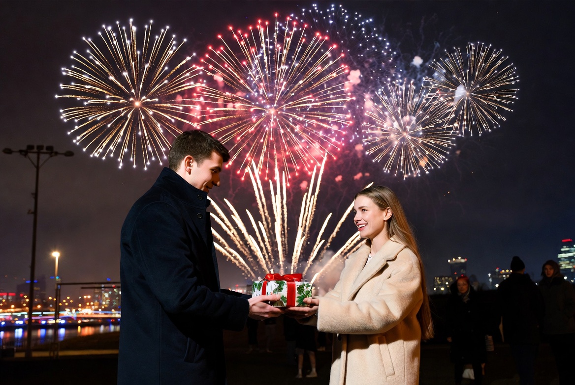 celebration, city, couple, event, festive, fireworks, gifts, happiness, holiday, joy, lights, love, new year, night, outdoor, romance, sparkles, special moment, togetherness, waterfront