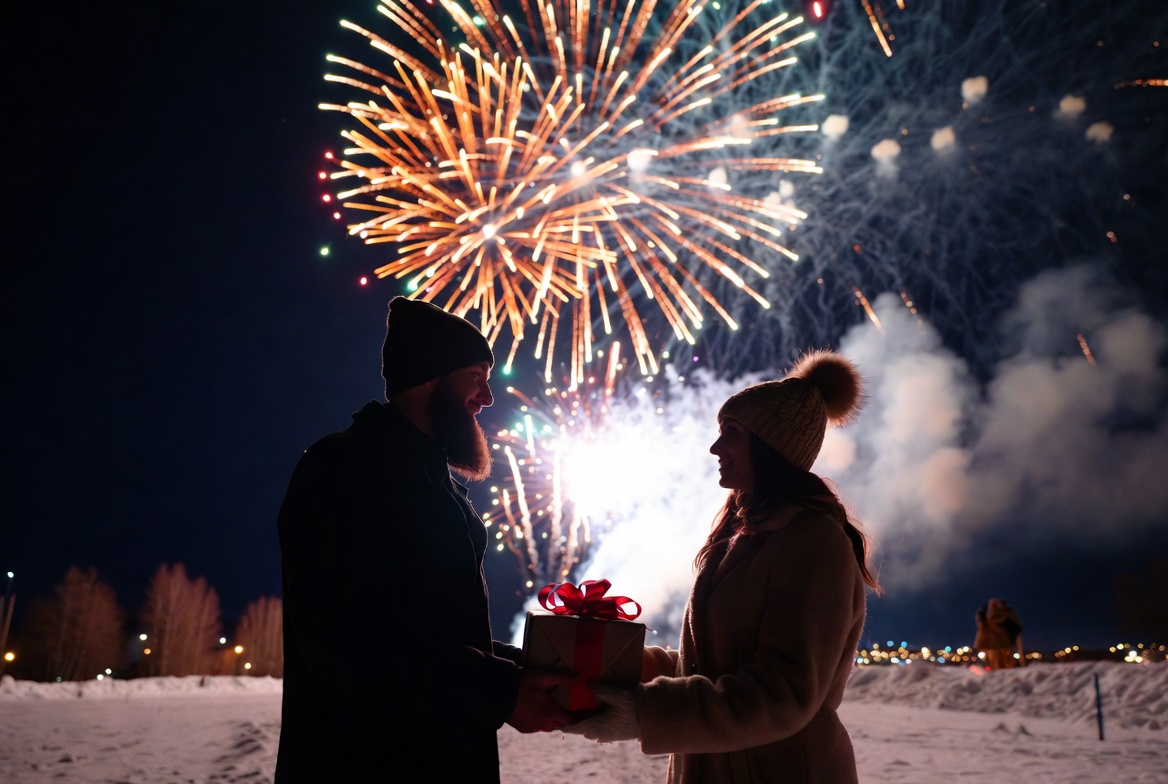 bright, celebration, city, couple, event, festive, fireworks, gift, happiness, holiday, joy, love, night, outdoor, romance, smiles, snow, surprise, together, winter