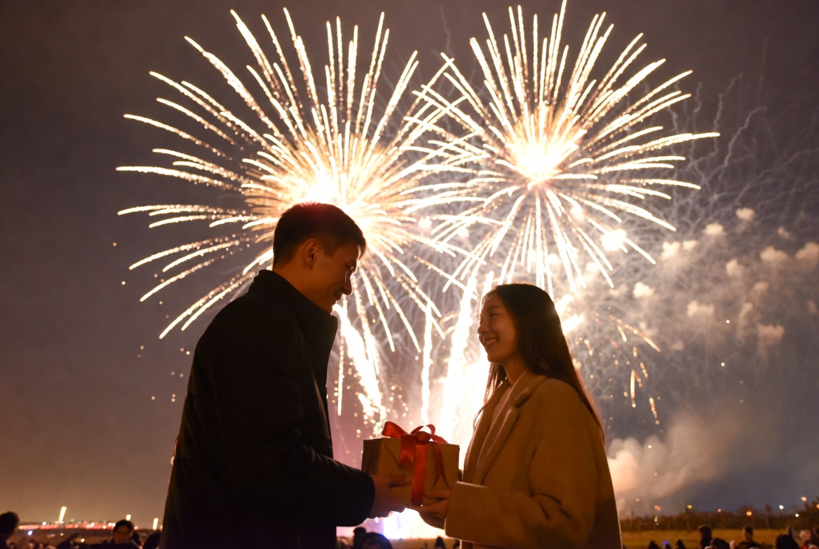 celebration, city, colorful, couple, event, excitement, festival, fireworks, fun, gift, happiness, joy, love, night, occasion, outdoor, reunion, romance, sky, together