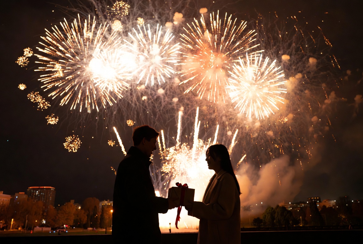 Two people hold a gift while celebrating under a vibrant fireworks show at night. The scene is filled with colorful explosions in the sky.