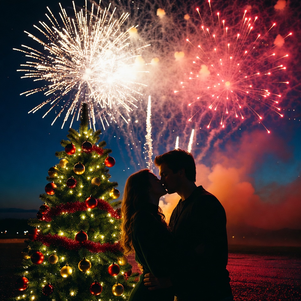 A couple shares a romantic kiss in front of a decorated Christmas tree while colorful fireworks light up the night sky during a festive celebration.