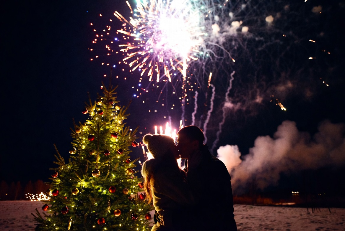 Christmas, atmosphere, celebration, couple, decoration, event, fireworks, happiness, holiday, joy, kissing, light, love, night, outdoor, romance, sky, togetherness, tree, winter