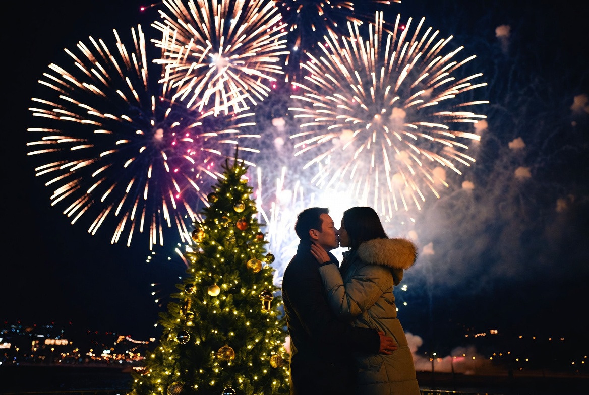 A couple kisses in front of a decorated Christmas tree as colorful fireworks illuminate the night sky. Joy and love fill the air.