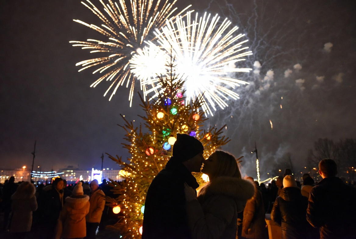 celebration, couple, decorations, event, festival, fireworks, happiness, holiday, joy, kiss, lights, love, new year, night, outdoor, party, romance, scene, tree, winter