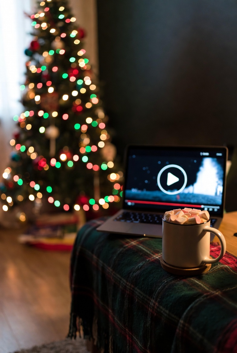 A warm living room scene features a laptop playing a festive video, a cup of hot cocoa nearby, and a beautifully lit Christmas tree.