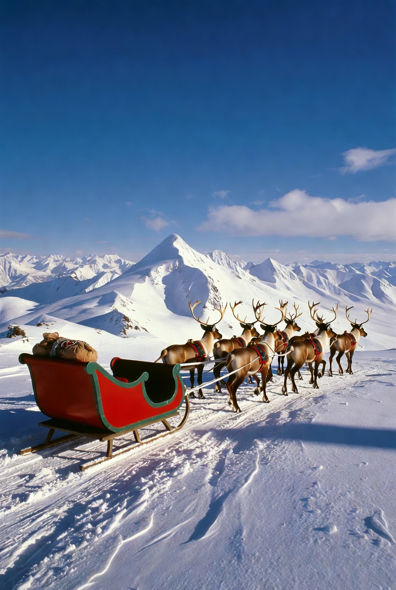 Reindeer stand in a snowy landscape, pulling a colorful sleigh with majestic mountains in the background under a clear blue sky.