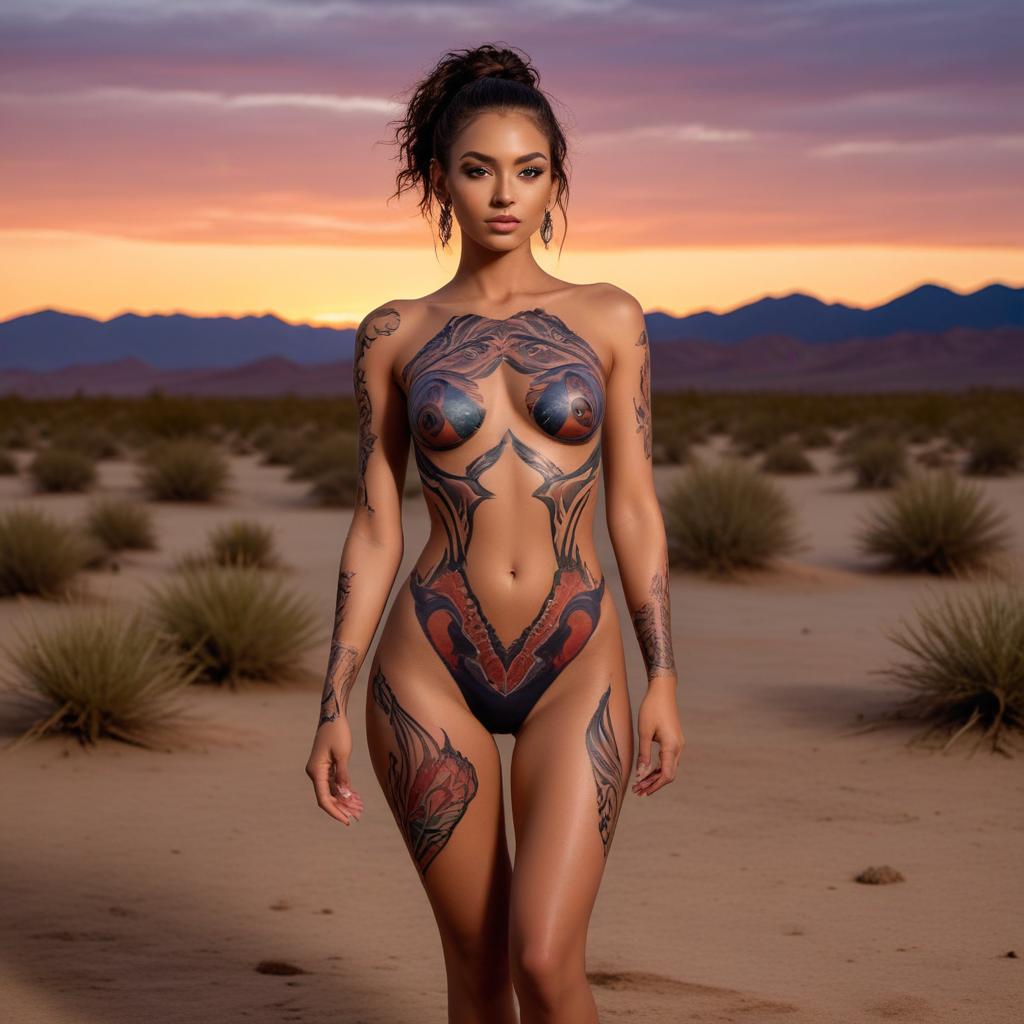 art, artistry, beauty, body art, colorful, creative, desert, elegant, evening, fashion, human form, landscape, model, nature, outdoor, sand, silhouette, sunset, tattoos, unique