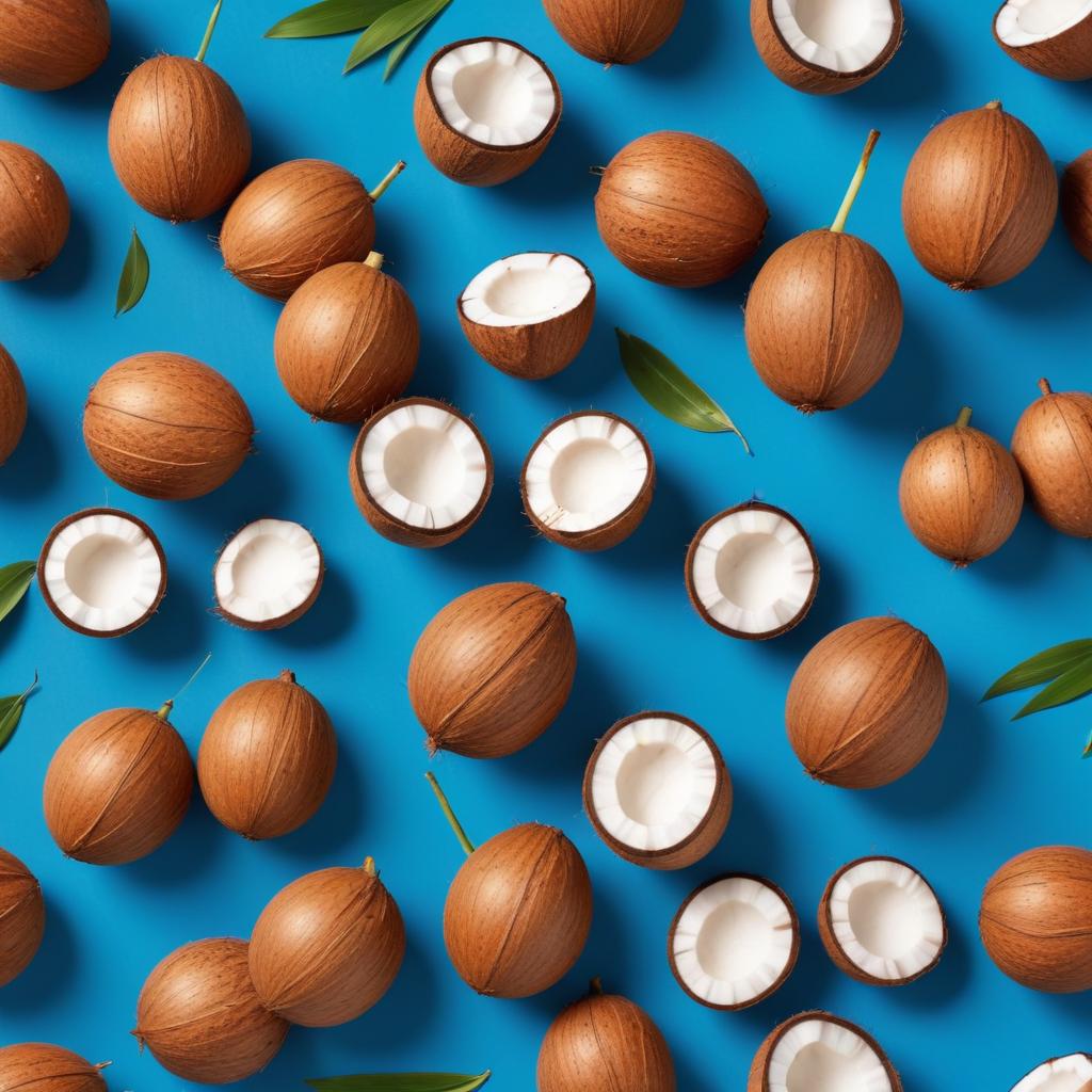 Coconuts lie scattered on a vibrant blue surface, showcasing whole and halved fruits with glossy white flesh inside.