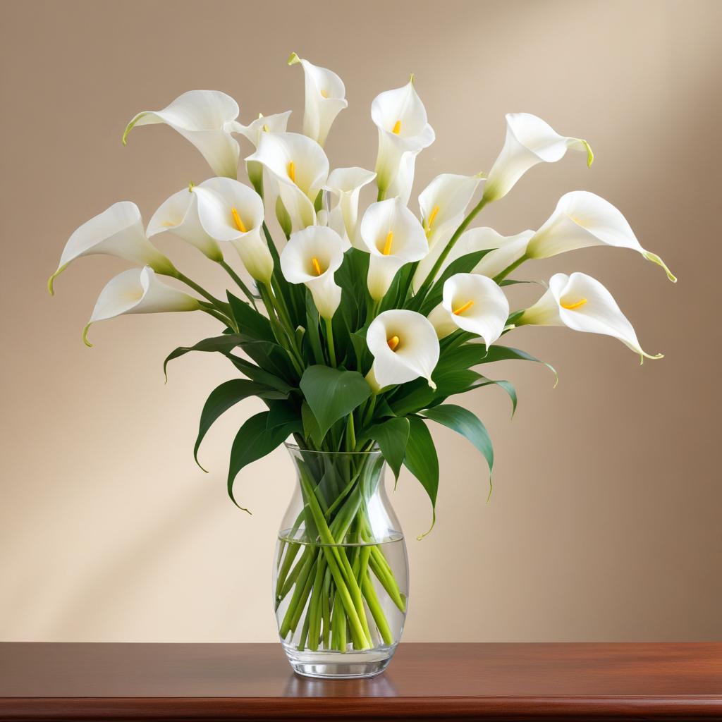 A stunning arrangement of white calla lilies stands tall in a clear vase. The flowers are fresh, showcasing vibrant green leaves and delicate petals.