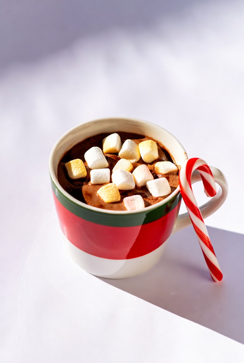 candy cane, chocolate, cocoa, coffee, comfort food, cozy, decorations, dessert, drinks, festive mug, holiday treat, hot chocolate, indoor, marshmallows, party, seasonal, sweet, warm beverage, winter drink, winter season