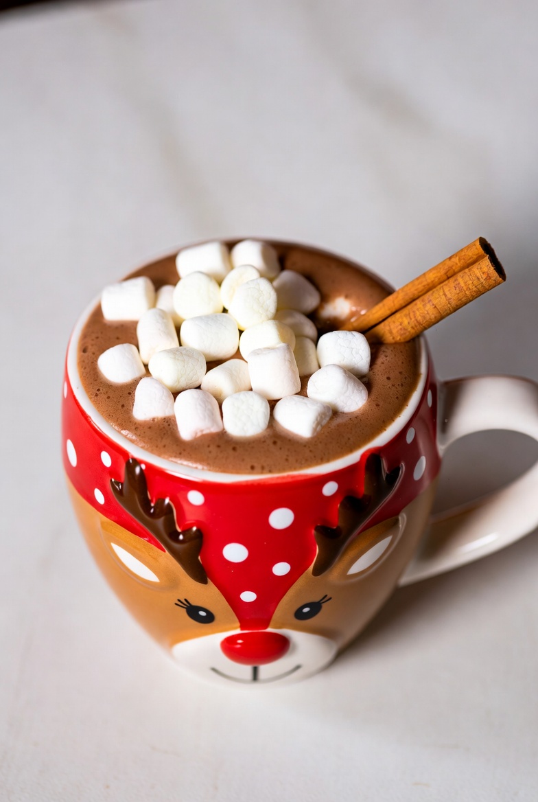 A festive mug filled with rich hot chocolate topped with fluffy marshmallows and a cinnamon stick, perfect for cold winter days.