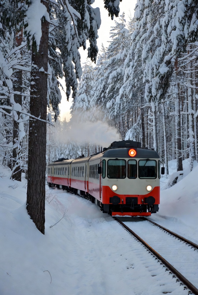 Train travels through snowy forest