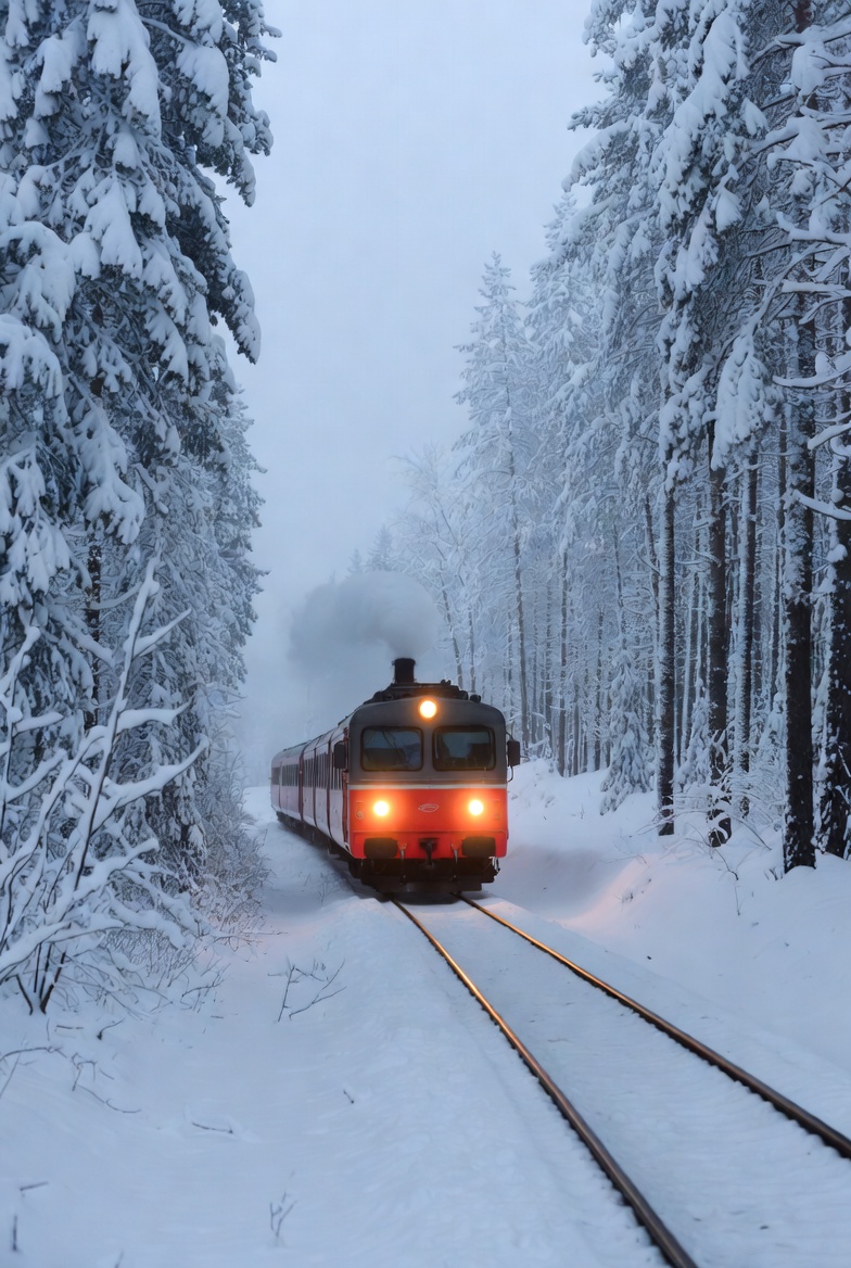 Train journey through snowy forest landscape