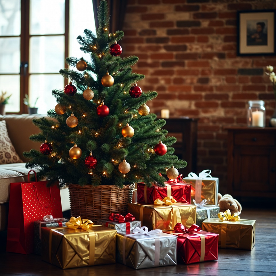 A beautifully decorated Christmas tree stands in a cozy living room, surrounded by colorful wrapped gifts and warm lighting.