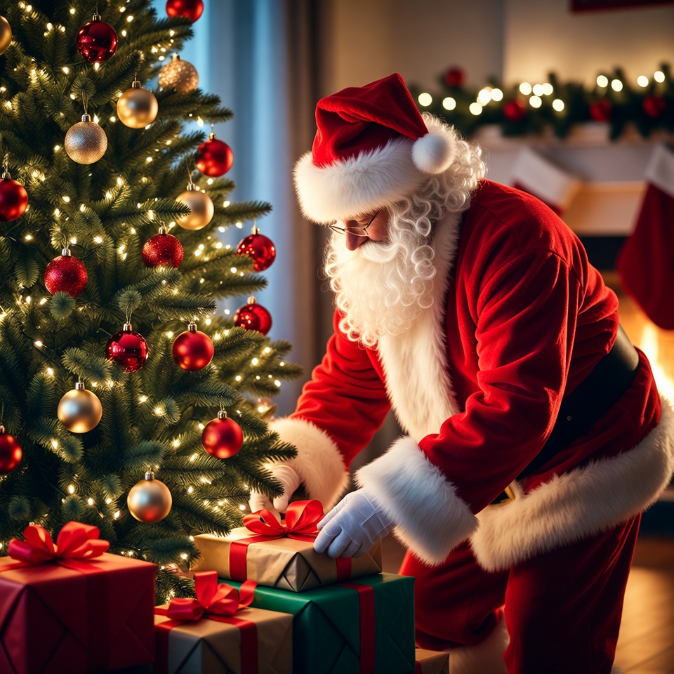 In a cozy decorated room, Santa carefully arranges colorful gifts beneath a bright Christmas tree, creating a festive atmosphere.