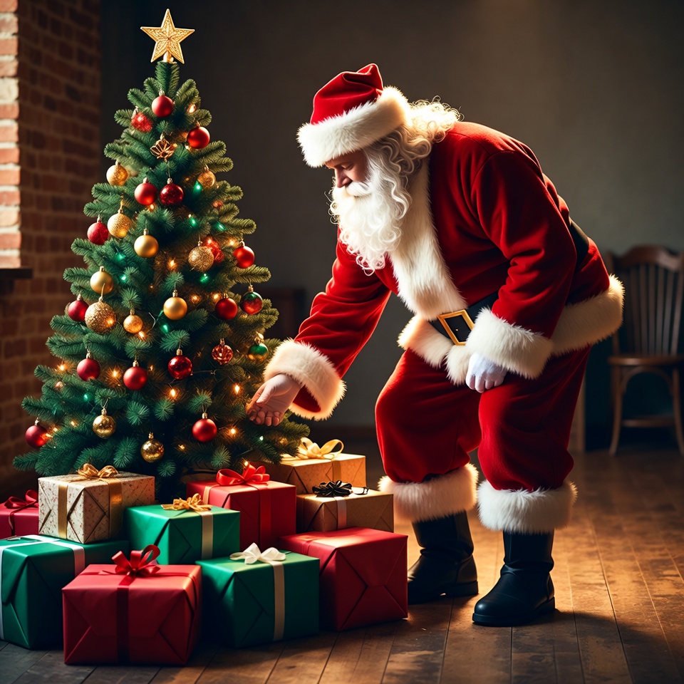 Santa Claus places colorful gifts under a beautifully decorated Christmas tree in a cozy room filled with festive spirit.