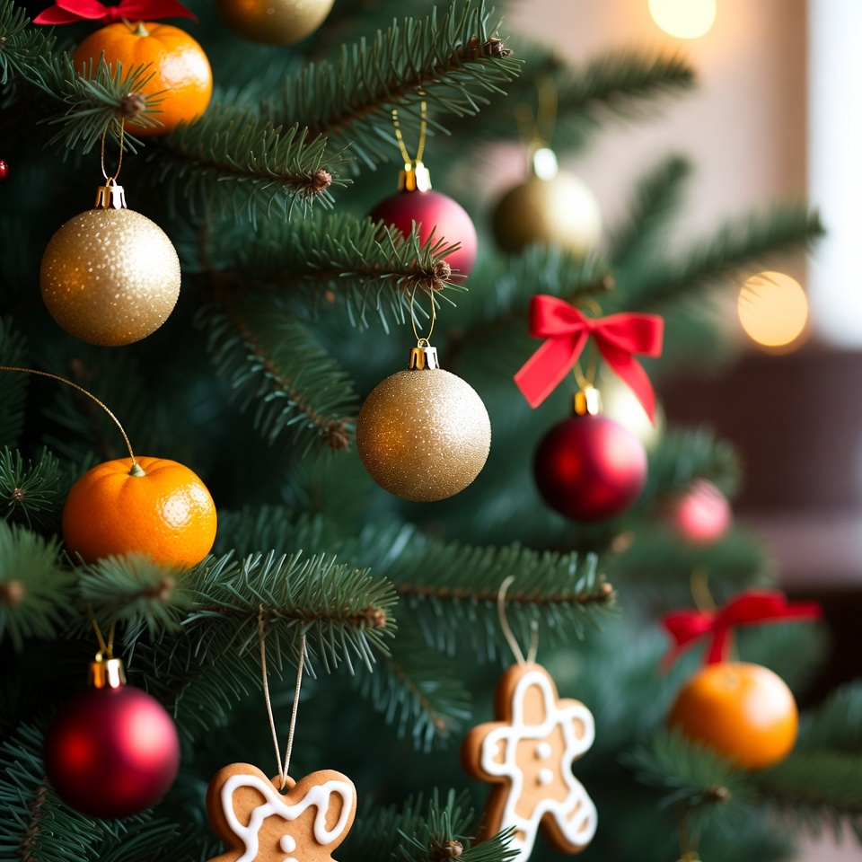 Bright Christmas tree decorated with gold and red ornaments, orange fruit, and gingerbread cookies, creating a festive atmosphere.