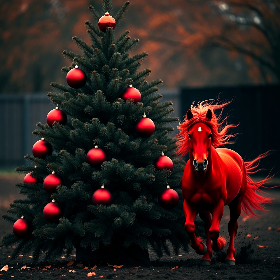 A bright red horse gallops past a decorated Christmas tree with red ornaments in an autumn setting, surrounded by fallen leaves.
