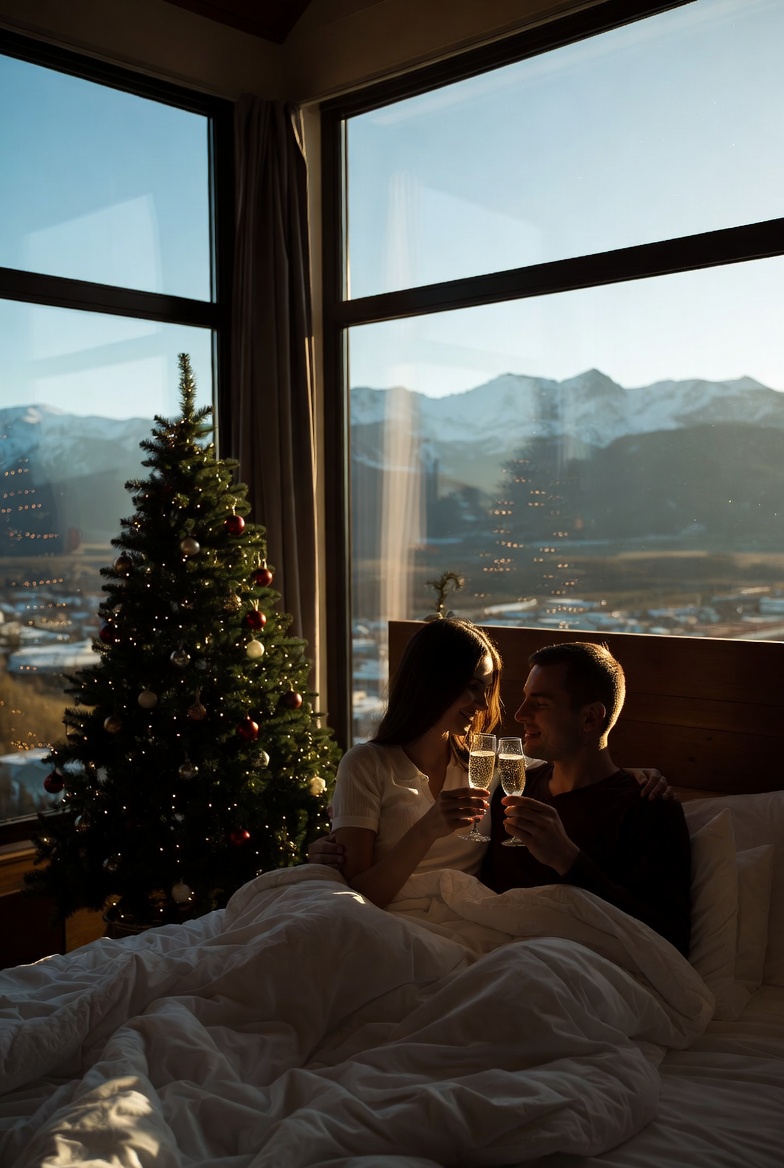 A couple toasts with glasses in a cozy cabin at sunset. Snowy mountains are visible outside, and a Christmas tree adds warmth to the scene.