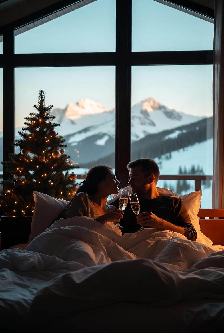 Cozy couple toasting with drinks in bed, enjoying a snowy mountain view through large windows and a decorated Christmas tree nearby.
