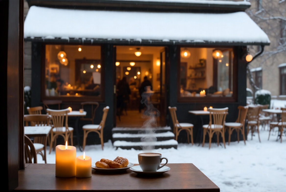 atmosphere, cafe, candles, coffee, cold weather, cozy, customers, dining, drinks, gathering, hot beverages, indoor lighting, outside seating, pastries, relaxation, serenity, snow, snowfall, warm, winter