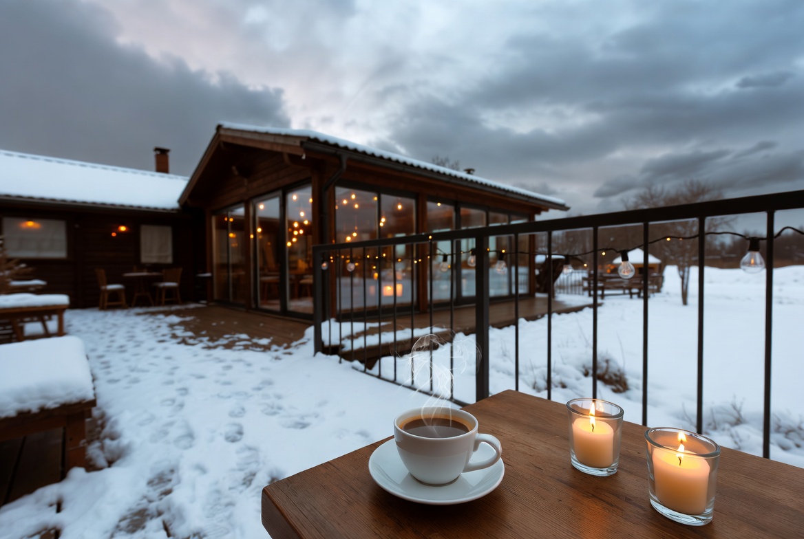 Enjoying a warm cup of coffee outside a cozy snow-covered cafe during a cloudy evening, with candles adding a warm glow.