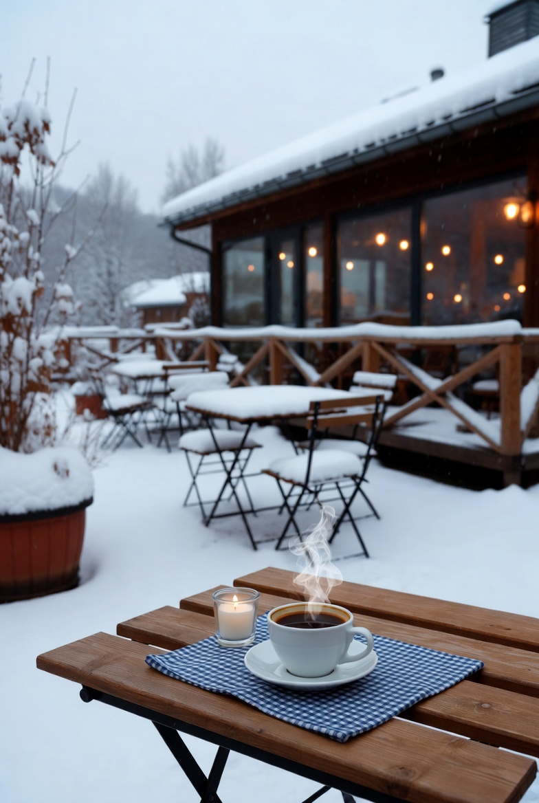 cafe, candles, coffee, cold weather, comfort, cozy, drinks, nature, outdoor seating, relaxation, rustic, scenery, snow, steam, table, urban, warm drink, warm light, winter, wooden table