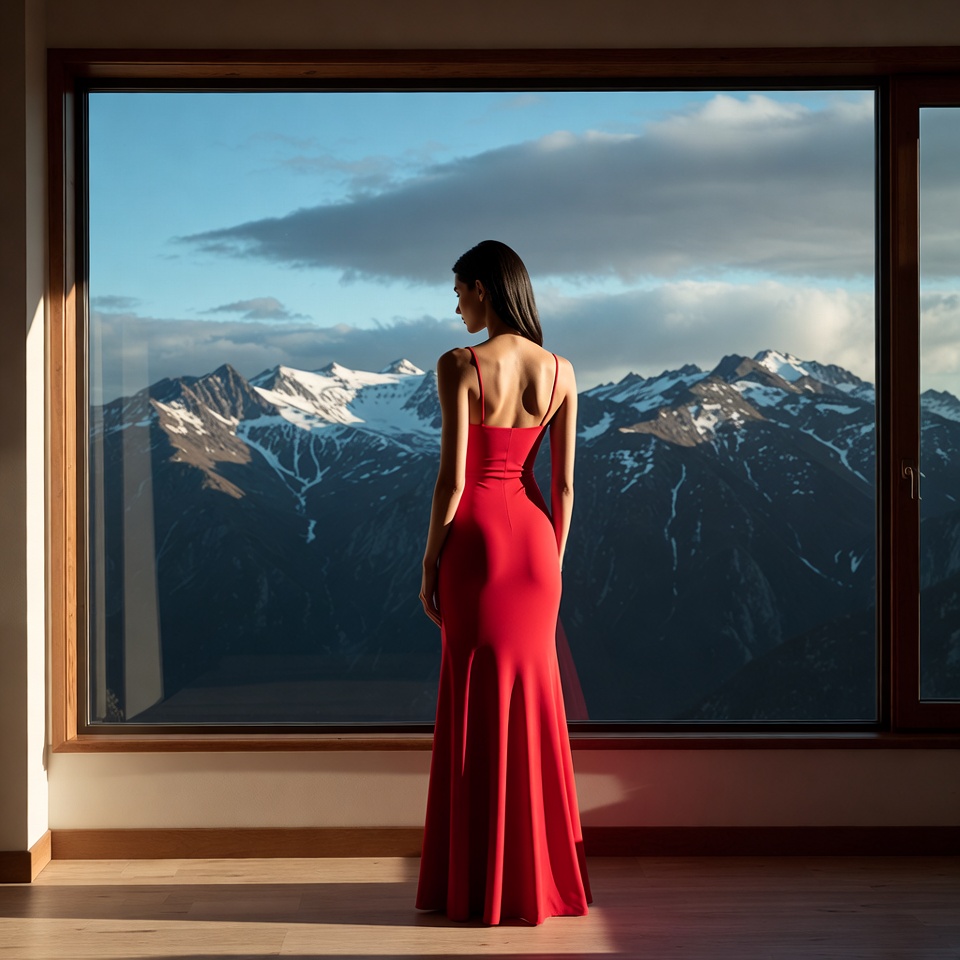 A woman in a sleeveless red dress stands by a large window. She gazes at the majestic snowy mountains in the background.