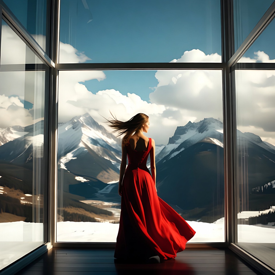 A woman in a flowing red dress stands by a glass window, gazing at majestic snow-capped mountains under a partly cloudy sky.