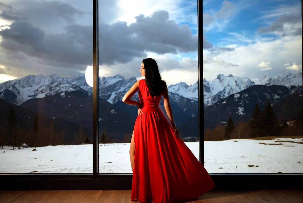 A woman stands in a flowing red dress, gazing at snow-capped mountains through a large window, capturing a serene winter scene.