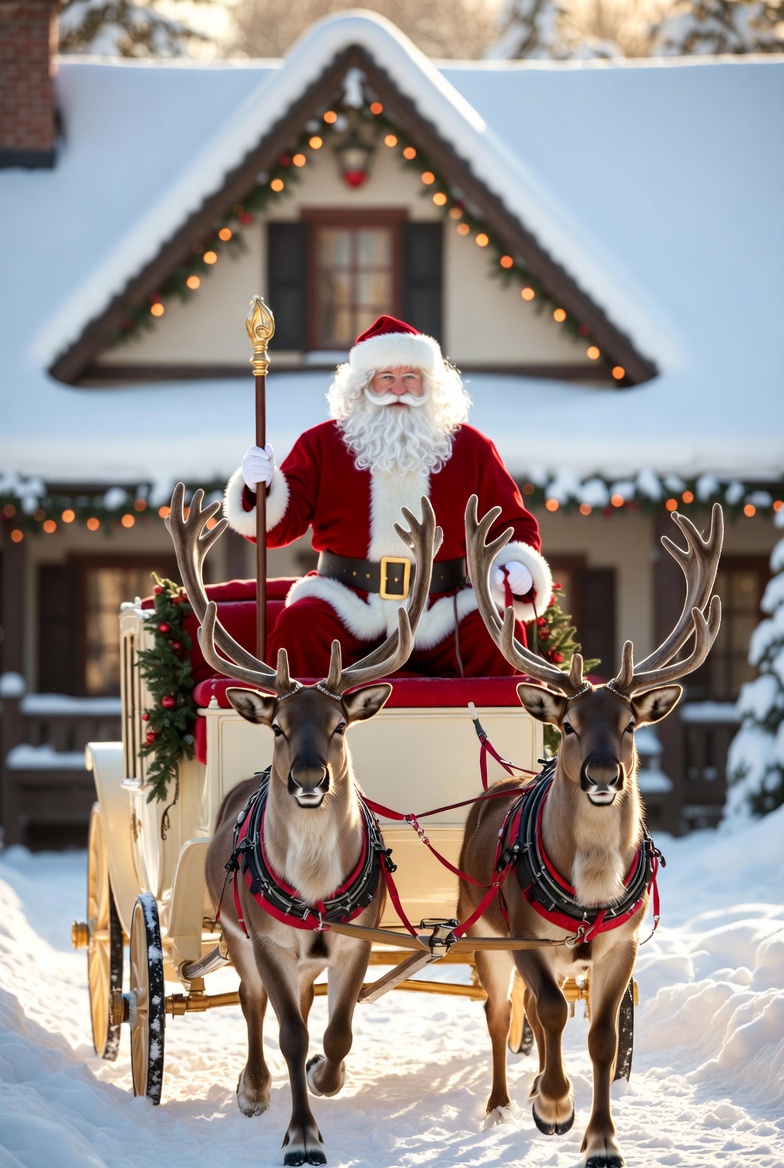 Snow covers the ground as Santa Claus rides in a festive sleigh pulled by two reindeer. A cozy home is in the background, adorned with lights.