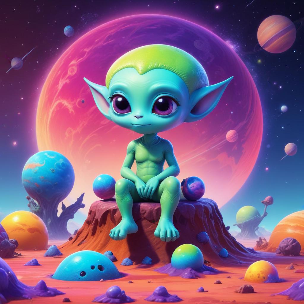 alien, child, colorful, cosmic, creature, cute, environment, exploration, extraterrestrial, fantasy, imaginative, planet, rock formation, scenery, sitting, space, stars, surface, universe, whimsical