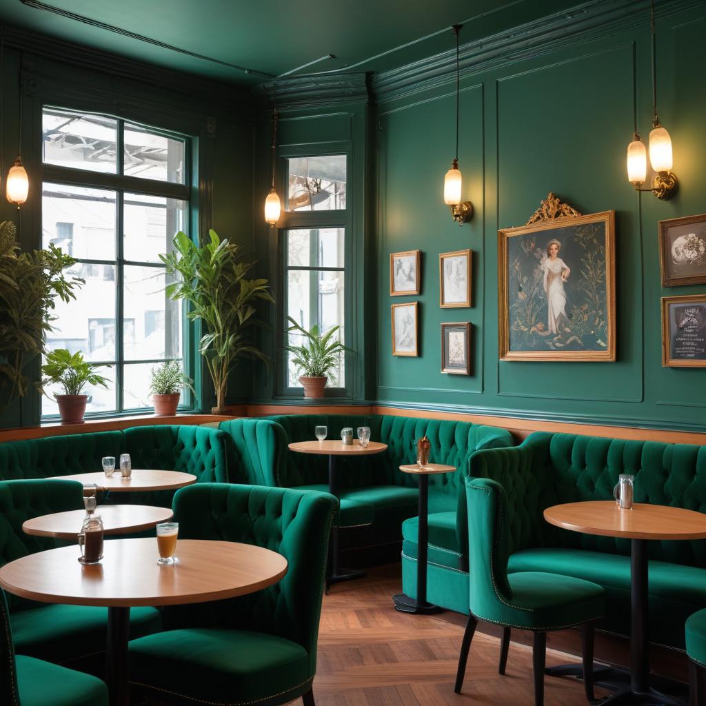 Cozy green cafe interior with plants