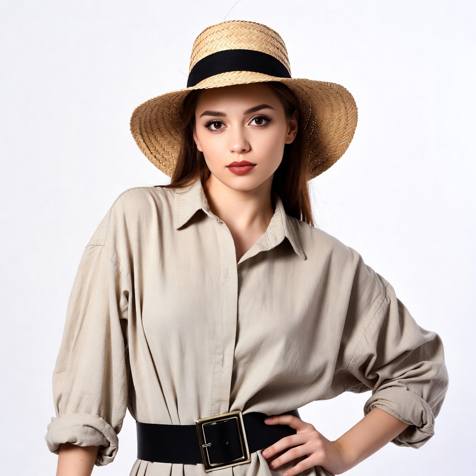 A young woman wearing a straw hat and stylish outfit stands with poise, showcasing her fashion sense against a plain background.