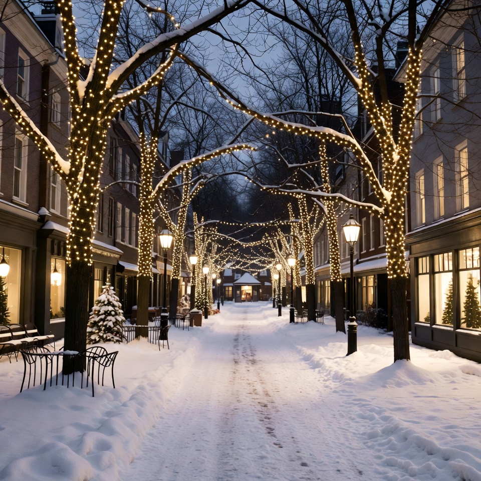 A serene street is covered in snow, lit by warm holiday lights. Trees line the path, while lampposts add to the cozy night atmosphere.