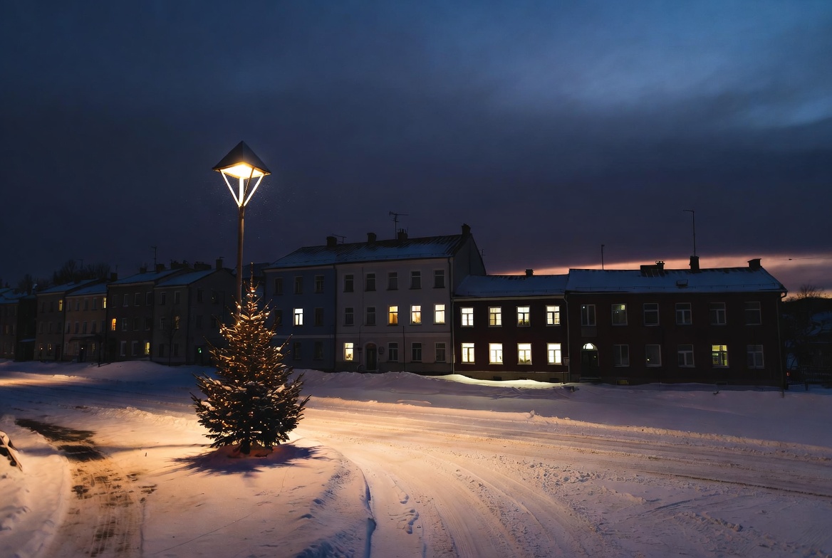 A beautifully lit tree stands in the snow as buildings glow softly in the evening light. A peaceful winter landscape unfolds with a serene atmosphere.