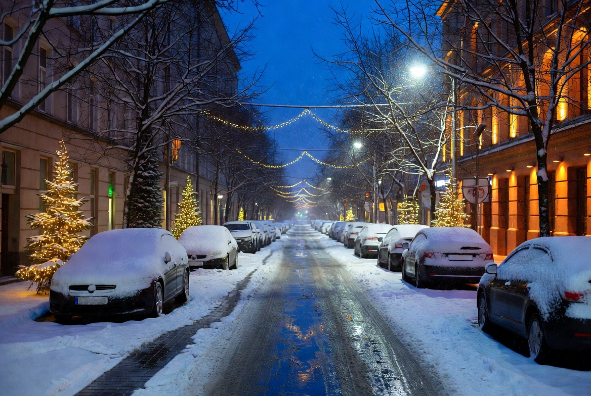 A tranquil street lined with snow-covered cars glows softly under streetlights. Holiday decorations and trees add cheer to the wintry scene.