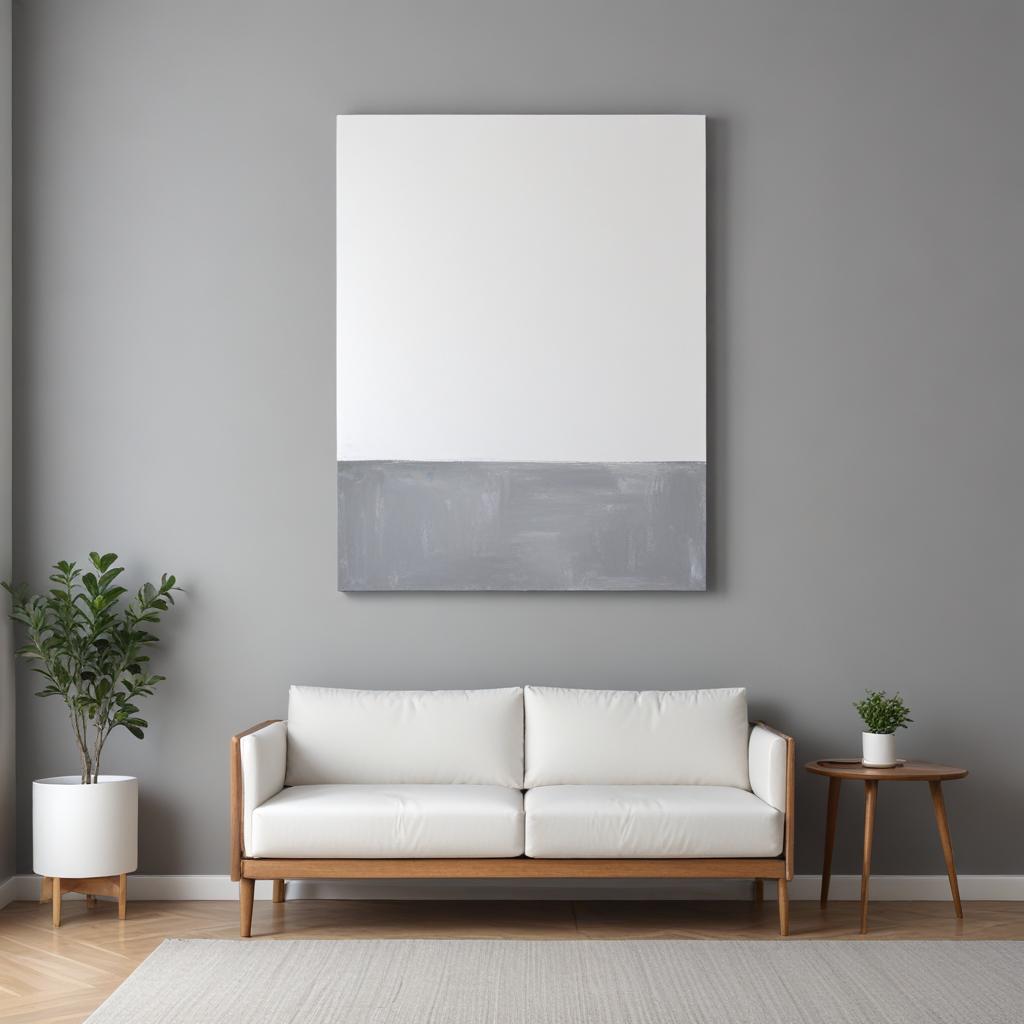 abstract painting, art, comfort, contemporary, cozy space, decor, furnishings, gray wall, home, interior, living room, minimalist, modern design, natural light, potted plant, relaxation, side table, simple furniture, style, white sofa