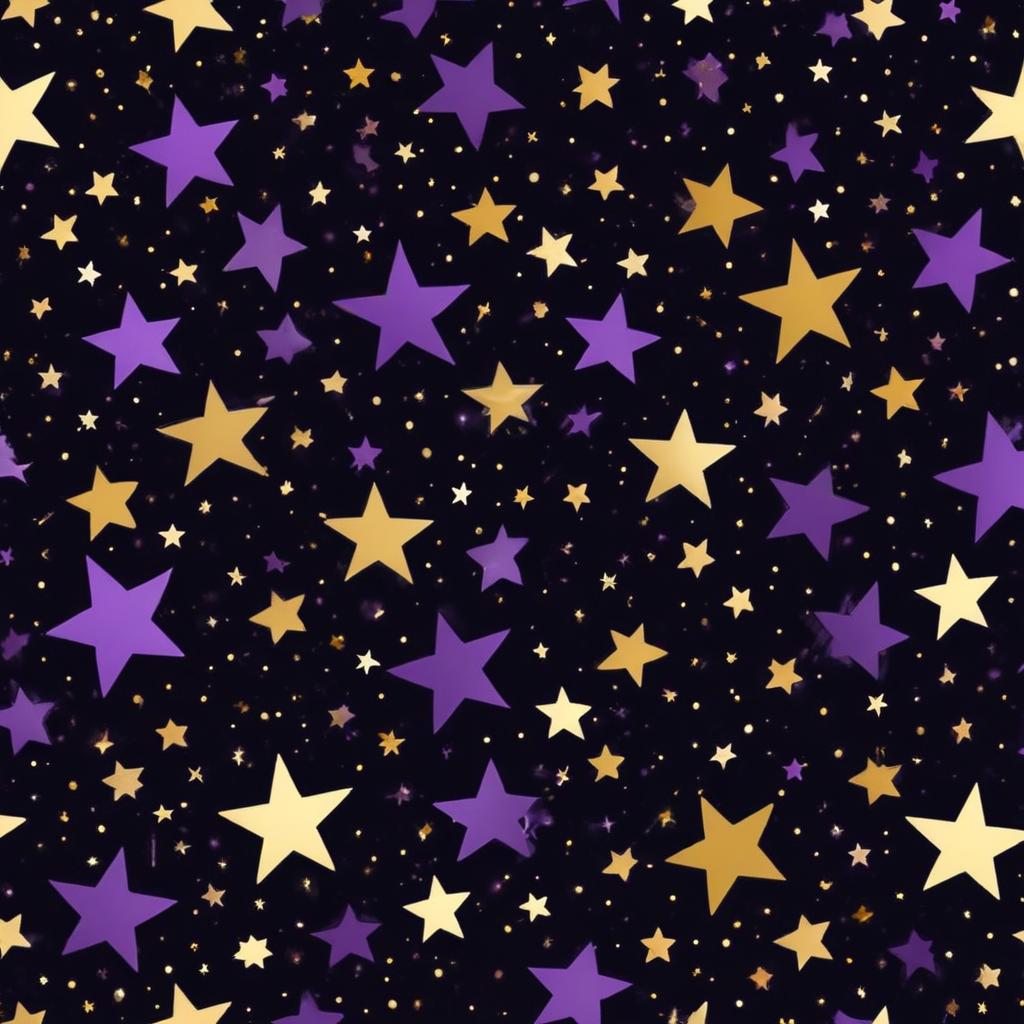 Bright purple, gold, and white stars fill a dark background, creating a lively and whimsical pattern perfect for festive decorations.